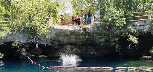 Our first cenote, I went with my 3 kids who had a blast jumping from the 12-foot high cliff into the greenish water. The water is green from the algae on the rocks below, but it’s VERY VERY CLEAR water, so don’t let that keep you away! The cave part of the cenote is super cool. We saw birds at the top of the cave eating what seemed like bees in a hive of sorts. The water in the cave was bright blue with beams of sunshine piercing through. So amazing! Small fish inhabit the cenote. One variety will nibble your feet (it tickles) to eat the dead skin cells (pedicure?). We saw iguanas around the cenote. I was hoping to see a monkey, but no such luck. There’s no zip line or repelling here, but still we spent 5 hours. We were the first to arrive a little after 8:00am. There’s a mini cenote pool when you first enter which we bypassed entirely. But there’s also a cute separate pool towards the back which is more secluded. The lush greenery including the mangroves all over make this place a tropical wonder. It really was amazing. There’s a little taco spot on the highway when you enter that we stopped at afterwards for lunch. They do sell limited snacks here, but you can also bring your own food in. And they provide life jackets, which you need to snorkel. Bring your own goggles and your own snorkel though. Oh, and it didn’t get too crowded. We went on a Monday in July. Cost: 200MXN per adult, 150MXN per...