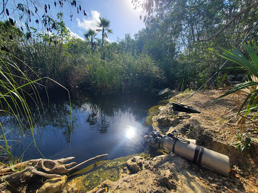 The place has no infrastructure at all, but at least you can park the car right next to the entrance, and the cave is awesome. A little bit deep when it comes to caves in Mexico (average 20m), which ends up making for a deco dive, or a shorter one. The line starts right at the bottom of the entrance, still within open...