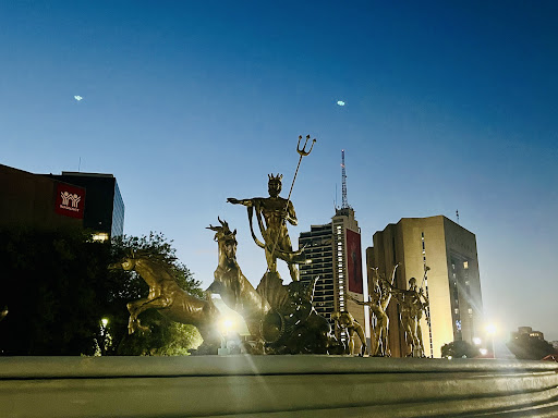 Read moreLa fuente de Neptuno es el monumento central de Macroplaza de Monterrey. Fuente y escultura que retrata a Neptuno, el dios de los mares romano, se construyó para conmemorar el plan hidráulico para abastecer de agua a la ciudad de Monterrey. Inaugurada en 1984, la Fuente de Neptuno es obra del artista español Luis Sanguino. La fuente tiene una gran escultura del dios Neptuno a bordo de un carruaje jalado por caballos, también otras esculturas, como la del niño que sostiene un pez o la de otro niño con un cuerno de la abundancia. Cada una simboliza la abundancia de peces y agua que llegó a Monterrey y el estado de Nuevo León, a través de la presa Cerro Prieto. Hay además una mujer montando un león y que porta otro cuerno de la abundancia, que simboliza al estado de Nuevo León y unas estatuas de alegres personajes que celebran la riqueza de las cosechas y el agua de la presa...
