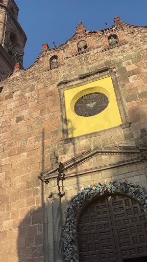 Fachada sobria y elegante: La fachada principal está decorada con motivos religiosos tallados en cantera, destacando un diseño sencillo pero imponente que refleja la transición del estilo renacentista al barroco.