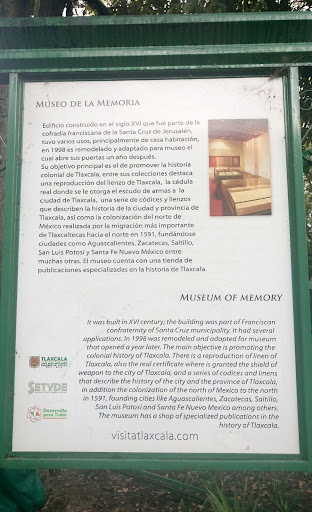 Read moreMuseo de la memoria de Tlaxcala, se encuentra hubicado en lo que fuera la casa de una congregación. Franciscana, sus colecciones mas importantes son documentos que hablan de la historia y transformación de tlaxcala, atraves de los tiempos. El museo de la memoria depende del fideicomiso del colegio de historia de tlaxcala, otros servicios que ofrece el museo son libreria con titulos especializados en historia y cultura del estado de tlaxcala, sala de expocisiones permanentes, y vitrinas del mes en esta ultima mensualmente se disponen temas variados del devenir histórico de la entidad, resultado de la investigación que se lleva a cabo en el archivo...