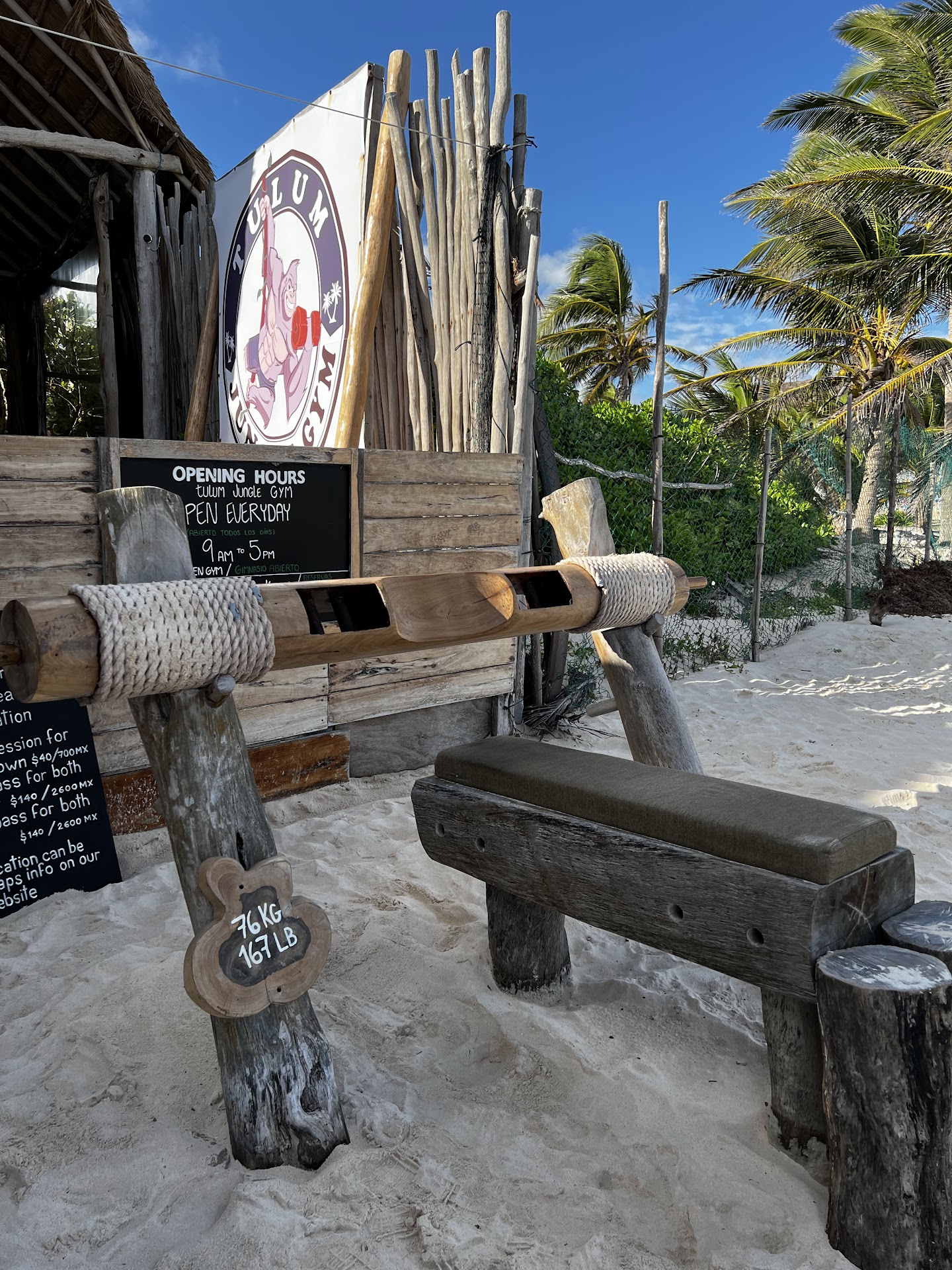 There is just something primal about utilizing the weights and equipment built entirely from tactile lindy materials such as wood, bamboo, and stone (all native to the Yucatán Peninsula by the way). This – coupled with the natural sand surface and saline ocean breeze – increases lifter proprioceptive awareness and provides for enhanced anabolic effect through elevated brain-derived neurotrophic factor production.