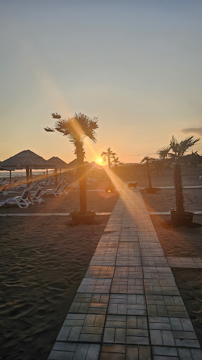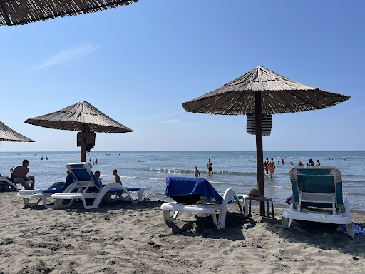 A perfect spot for families. The beach offers a large, shady parking area and a well-maintained sandy shore. The beach is divided into three sections based on the type of sunbathing options available. There's a spacious area with sunbeds and umbrellas, and two smaller sections featuring hammock beds with sun sails and reed-covered huts. The huts provide the best shade and cost around €12-30, similar to the hammock beds.