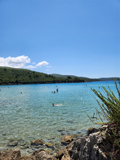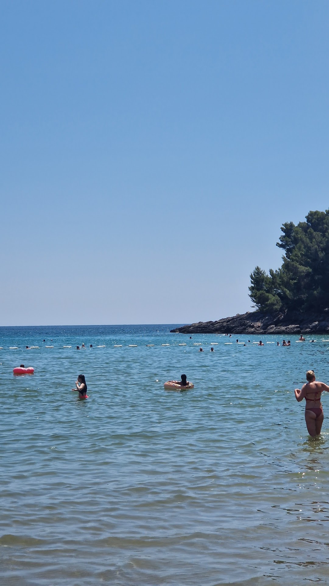 The beach is sandy, with few rocks here and there. Also the seabed is clean. The water at the enterence can be blurred when there is a lot of people, but if you go further it is crystal clear. The water is shallow for 50-60 meters, and than rapidly deepens. Perfect for families.