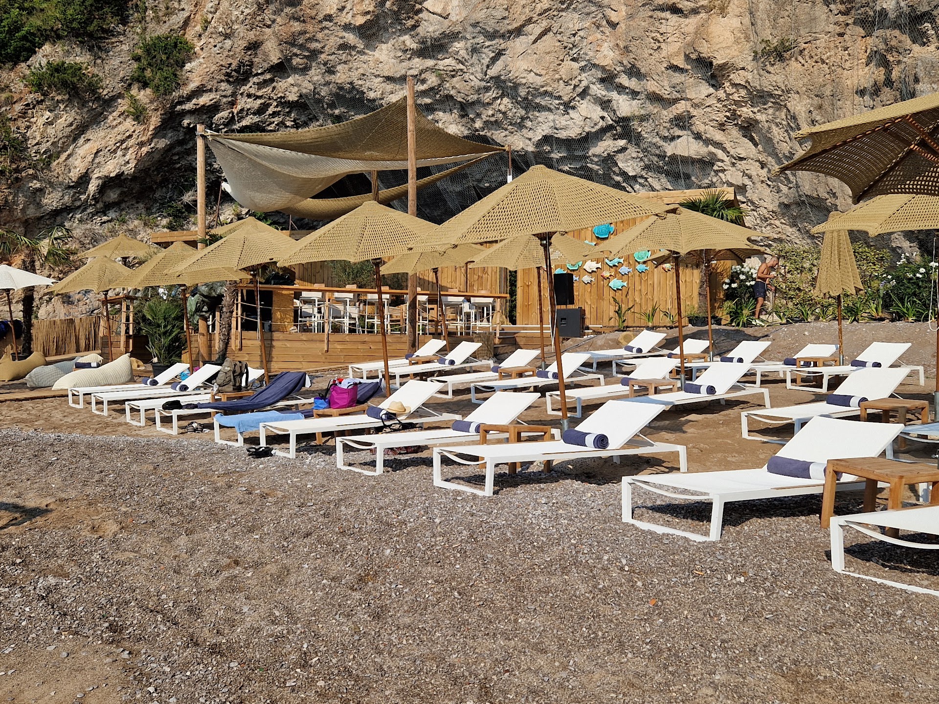 Read moreA gorgeous setting, but an abysmal road leading to the beach, construction all around and a highly pretentious grossly overpriced private beach club section. The parking is free (if your car can survive all the piled up gravel), and the free part of the beach is very pleasant (as I'm sure the beach club experience is, but if I was going to pay €70 for two sunbeds I'd certainly expect a...