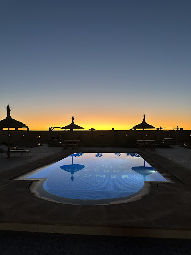 An incredibly beautiful, and unique luxury Riat with stunning views of the desert. Hassan and every staff member were extremely welcoming and caring, making every minute of our stay like at home. The rooms have a unique interior design, which I haven’t seen elsewhere, not to mention how cozy the bed was with looks out the window to the desert horizon. The night stands are built into the wall with additional, window-like stands above your head to place additional night-objects—truly unique. Another unique detail were the roses placed alongside the soap/shampoo in the shower. Simply staying at this Riat is a relaxation therapy: it’s incredibly quiet, and the pool area and terrace are simply stunning, with seating and resting areas around the pool with incredible views of the desert horizon. You can watch the sunset from either one, and be amazed at the beauty of the Sahara or get on your back at one of the seating areas and gaze at the stars—a mesmerizing experience. When I sat down at the restaurant to eat breakfast, lunch or dinner, I truly felt like a queen. Dinner for one is a banquet, with 5 different courses of mouth-watering Moroccan food, served alongside tea, coffee, fresh pressed juice or anything else you request! I especially liked the apple smoothie made with banana and milk during breakfast: delicious! If you want a treat, book a stay at this Riat. It’s a truly...