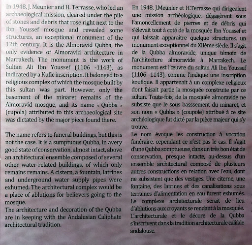 The Almoravid Qubba is a historical structure erected by the Almoravid dynasty in the early 12th century. It is notable for its extraordinary decoration and for being one of the only remnants of Almoravid architecture in Marrakech. This Koubba, which historians of Muslim art qualify as 'extraordinary', rises in the middle of a courtyard surrounded by 19 public latrines. Buried under several metres of earth and ash, it was not excavated until 1952. This small building was once part of a lost Almoravid mosque, where it was used for ablutions before prayer. The koubba had a system of toilets, showers, and taps. Its water was extracted from underground aquifers and transported by bronze pipes. Place was recently under restoration and now is again...