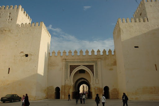 Bab Dekkakin or Bab Dekakene (Arabic: باب الدكاكين, romanized: bab ad-dekakin, lit. 'gate of the benches') is a fortified and ceremonial gate in Fes, Morocco. The gate is situated between the Old Mechouar (or Vieux Méchouar) and the New Mechouar (or Nouveau Méchouar) on the northern edge of Fes el-Jdid. The gate's original name was Bab es-Sebaa ("Gate of the Lion"), probably about a carved image or motif of a lion that has since disappeared. Originally, the name "Bab Dekkakin" was the name of what is now the gate to the Royal Palace itself, which was formerly the main entrance to the city (originally called Bab el-Oued or Bab el-Qantara) before the palace expanded to this point. Only later did the name come to designate Bab es-Sebaa. The name Bab Dekkakin means "Gate of the Benches" and is a reference to the previous existence of benches along the sides of the gate where those who were granted an audience inside the Palace would wait...