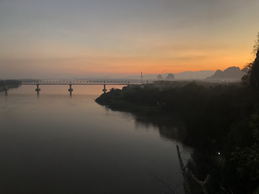 While a cave does exist and holds all the bats, you don't see it nor walk in it, you will arrive at a gate where 1000kyat entrance is admitted than walk 50 more meters to the Pagoda platform and stairs where you can either walk up around 20meters for a beautiful view over the river, the mountains to the east and the south and see the big bridge. Sunset is beautiful but you DO NOT see the sun. Inly the reflection on the river and the water. You have the mountains blocking the west. At sunset one of the monks will making sounds that make the bats leave the cave, this goes on for around 20 or more minutes in a constant endless stream of bats, hard to see them at first if you are on the pagoda's top but once they swarm above the river it is a nice sight to behold. If you stay down you will see them real well but have less of the panormaic view of the complete massive swarm, I'd say try both as it goes on for a very long time. Start up for 10 minutes...