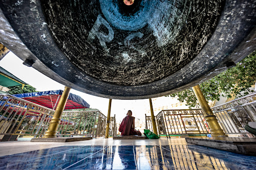 The golden and white exterior is breathtaking, especially at sunset. Each entrance is guarded by mythical Chinthe statues, adding to its grandeur.