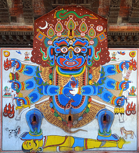Chandeshwori Temple is located in Banepa, about 25 kilometers east by road from central Kathmandu. The site's primary attraction is its lofty three-tiered mandir, last rebuilt in the 17th century. It enshrines Chandeshwori, one of the Nine Durgas (Navadurgas) and a goddess cognate with the Tibetan deity Ekajati. Legend credits Chandeshwori as the slayer of the demon Chanda, for which she is widely regarded throughout Nepal. In ages past, Chanda ran amok after being granted a blessing by Shiva that shielded him from death, making him immune to attacks from both gods and men. With the gods powerless to stop him, Brahma counseled that Chandeshwori should be sought out in the distant Raktachandana forest near Banepa. When the gods came upon her, she agreed to help, but the panic-stricken gods transformed themselves into birds and flew away at the first sign of Chanda's approach. Chandeshwori was left to engage Chanda alone, fighting a long and destructive battle that laid waste to the landscape, leaving behind a rocky moonscape whose traces can still be found around Banepa today. However, in time, Chandeshwori prevailed, killing Chanda with a stab from her trident. From his body, a lingam spontaneously emerged, erupting through his belly. Today, the lingam can still be found within the small brick temple to the north of the Chandeshwori mandir (rebuilt after the April 2015 earthquake). In honor of the goddess, her pagoda was established nearby. She is honored each year at Baisakh-Purnima, a date also honoring the birth, enlightenment, and death of the historical Buddha, Gautama. The three-tiered pagoda is notable for its asymmetrical facade. The reason for this is not clear, but Dowman speculates it may be due to "some obscure ritual necessity" (Dowman, p. 320). On the west wall of the temple is an enormous mural of Bhairab, the god of terror, who is often to found at the temples of the Navadurgas. The mural depicts a dancing Bhairab, poised over a corpse's reclining form. Flanking him are his constant companions—dogs whose presence is always found at charnel grounds. The mural is repainted annually in traditional format. Bhairab also appears on the temple's roof brackets, in the form of the Ashtabhairabs (Eight Bhairabs), who are paired with the feminine forms of the Ashtamatrikas (eight mother goddesses, also...