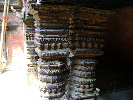 As Kumari Baha has three proper entrances, one each on the west, north and east sides, which each lead immediately in the vestibule. The vestibule has a wooden post and lintel frame and two carved wooden pillars. Toranas surmount the 12 single bay windows on the north, east, and west courtyard walls' second level. As seen on the exterior, each courtyard walls third level has a five bay window at the centre, which is flanked by two single bay windows. Kumari Baha main shrine is located on the courtyard's south. The kvahpah dyah is located on 1st level in the centre of the south. Kvahpah dyah at Kumari baha contains 5 stone sculptures of the Jina (victory) Buddhas as the central objects of worship. At Kumari baha, the agam is located on the south wall’s 2nd level, directly above the...