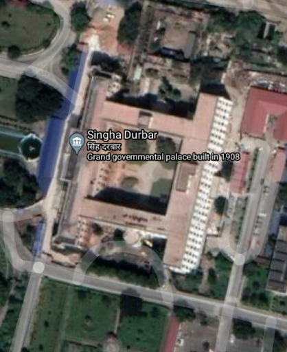 Singha Durbar (Nepali: सिंहदरवार; translation: Lion's Palace) is a palace in Kathmandu, the capital of Nepal. The palace complex lies in the centre of Kathmandu, to the north of the Babar Mahal and Thapathali Durbar and east of Bhadrakali.2] This palace was built by Chandra Shumsher JBR in June 1908.[3] The palace used to be one of the most exquisite and lavish of palaces in the world until the 1950s.