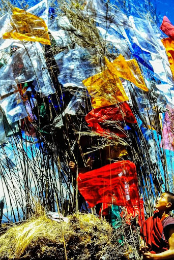 These photos show the last part of a religious ceremony atop a ridge high above Tengboche monastery where young monks are replenishing prayer flags and burning cedar, rhododendron, and juniper branches to produce a fragrant smoke while their elder colleagues chant from ancient texts and blow the long...