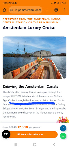 Adding a picture in response to the owner's response below. If none of your boat tours go through the Jordaan, then maybe you need to change the online description that you have posted on your own website?? Original review: it was a beautiful day on the water, but the tour we booked was not what we got (booked Luxe, but got Heineken and didnt go anywhere near the Jordaan etc.) and the guide was too inexperienced. I realize that it is the busy season and you are probably short on staff, but there was hardly any tour, just an hour on the water. I had done a Flagship tour before and loved it, but on this one we got maybe 1/10th of the info compared to the previous one. Disappointing.