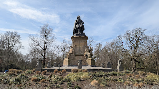 Read moreThis bronze statue was sculpted by Louis Royer in 1867, with the pedestal designed by Pierre Cuypers. It honors Joost van den Vondel, a leading poet and playwright of the Dutch Golden Age, often called the "Prince of Dutch poets." Vondel is depicted seated, holding an open book and a quill. The pedestal is adorned on all four sides with stone figures representing the classical muses of...