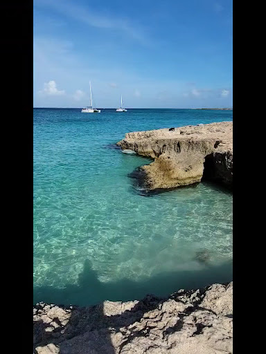Is there an expanse of water more beautiful than this on planet earth???? I have been visiting Aruba every year since 1989. But I never discovered Tres Trapi until last year. The local newspaper, Aruba Today, did an article about it. So my son Austin and I walked the entire length of the Malmok Boardwalk and continued on by foot to Tres Trapi. The name means "three steps." Someone carved three steps into the rock so snorkelers could have access to one of the primo snorkeling spots on the island. Not too far from here is the famous shipwreck, but you need to be on a boat to get there because it's further out to sea. The beauty of Tres Trapi is you can walk or easily park your car to see some of the best fish on the island. You can't beat it's accessibility. Do note there is really no beach. You come here to enjoy the three shades of turquoise blue water and the glorious schools of fish. The craggy rocks are not meant for sun bathing. I don't snorkel but I love this place because the sea is so gorgeous. There is a God! Just look at that water. There is plenty of parking if you don't want to hoof it. Baby Beach is another otherworldly place to snorkel, but it's at the other end of the island from the resort Strip. Tres Trapi is just down the road. Check it out. Plan to...