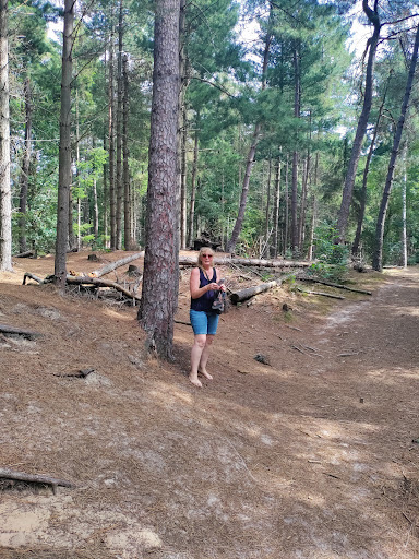 We hadden langs de weg geparkeerd waar google aangaf dat het blote voetenpad was. Als je het bos inloopt zie je het blotevoetenpad meteen aan je rechterhand bij de totempalen. Als je geen zin hebt om je schoenen de hele tijd mee te slepen, dan kun je ze prima in de auto laten staan. Het pad eindigd waar het begint. Erg leuk blote voetenpad van 2,5 km. Wij (ik 44 met zoons van 8 en 10) hebben er bijna 2 uur over gelopen, maar hebben er alle tijd voor genomen (rustig gelopen, drink/eetpauze, een extra keertje door het water lopen en bomen klimmen). Leuk dat je door verschillende soorten landschappen loopt. Bos, water, tegels, zand. Eerst loop je door het bos en later loop je ineens over een soort zandduinen met heide en waan je je in een hele andere wereld . Je hebt er ook leuke bomen om in te klimmen.