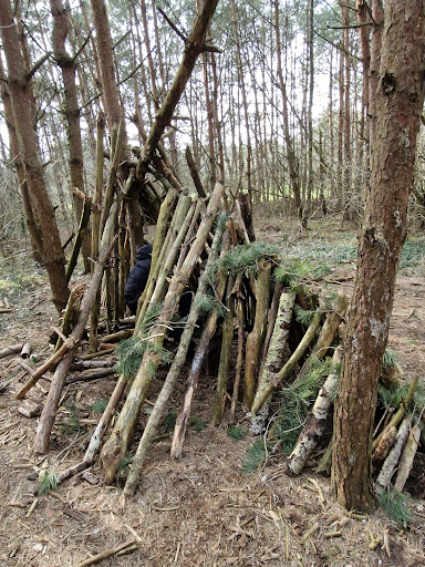 Een klein bosje waar hutten gebouwd kunnen worden. Er zijn in het bos zelf ook wat banken neergezet om te zitten. Let vooral bij de ingangen en in het bos op de details die er in het hout zijn gemaakt. Buiten de oostelijke ingang zijn erg veel...