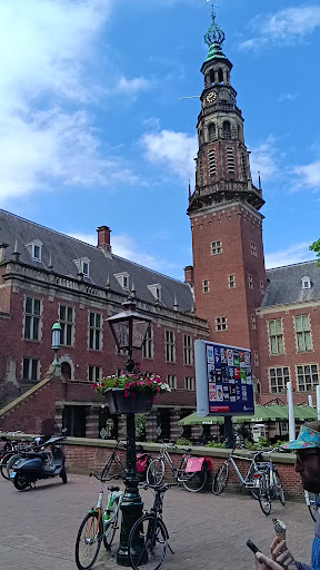 Een gebouw dat zijn weerga in Nederland niet kent, zo denk ik erover. Het kan echt wedijveren met de mooiste gebouwen in Holland of zelfs in Nederland. Het aantal interessante details in de afwerking is bijna niet te tellen en daarbij is het monumentale gebouw recentelijk gedurende een jaren durende opknapbeurt, gerenoveerd en vandaag de dag als ´door een ringetje te halen´, zo mooi. De hoofdreden dat het gebouw niet de waarde krijgt toebedeeld die het verdient is overigens wel een legitieme reden. ´Broadway´ ofwel de Leidse Breestraat... zij is immers de naamgever van Broadway is een regelrechte ramp qua verkeersplanning, en een ramp waar nog geen enkel gemeentebestuur in de laatste decennia tot nu toe mee uit de voeten kon... Ten eerste is het ´het grootste tochtgat van Leiden´, dit komt voornamelijk door haar Noordwest lopend naar Zuidoost ligging, die is ongunstig. Het is er altijd kil, en ´een trekgat´ dus van jewelste. Het 2e nadeel is nog groter: een lawaaieriger en stinkendere plek in ons land ken ik zelf niet. Het lawaai van per dag duizende keren passerende bussen, oude tweetakt Thomos brommers ´from Hell´, brommers die blauwe walmen uitbraken achter de vermoeid ogende bestuurders, en dan niet te vergeten de pizzakoeriers die langs´knallen´ of ze levensmoe zijn en vooral ook de eeuwig heen en weer rijdende schoonmaakvehikels van de gemeente die een werkelijk razend lawaai maken..., deze verkeersdeelnemers zorgen tezamen voor de zeer onaangename omgeving waarin het stadhuis zich bevindt. De stoepen op de Breestraat zijn daarbij ook nog eens zeer smal en de aangrenzende panden relatief zeer hoog waardoor alle lawaai versterkt wordt en de uitlaatgassen blijven hangen. Ik stel u maar u op de hoogte van deze belangrijke ´details´, gronden waarop u wanneer u daar eenmaal aangekomen bent het liefst meteen weer vertrekt... Nou een ander detail op het gebouw zelf dan maar: derde raam vanaf rechts (vanaf de hoek) ´met cafe ´Burgerzaken´ in de rug´, kijk naar het middelste ornament vlak boven het onderste raam, dus op de begane grond, u ziet daar ´een man en vrouw en een huisje´. Waarom zou iemand dat symbool daar nu stiekem, vanuit liederlijkheid of andere vorm van genomen vrijheid, uit het zandsteen geschraapt hebben? Graag hoor ik uw antwoord. O ja, het voor het stadhuis gebruikte zandsteen kwam uit West-Duitsland en wel uit ´Bentheim´ uit een zandsteengroeve aldaar. Daarna werd het eerst naar Bremen gebracht, daar werden de zandsteenblokken op maat gezaagd en genummerd. Uiteindelijk kwamen ze zo in Leiden terecht. Dit Stadhuis is echt markant te noemen: qua vormgeving, de trappartijen, de Rijnlandse roede die er aan de buitenmuur is bevestigd, en de schitterend aangelegde ´Speakerscorner´ die u via een klein trapje betreedt. Daarna mag u daar uw verhaal doen aan het razende verkeer en een enkele voorbijkomende wandelaar. Of die gaan luisteren naar u hangt direct af van de kwaliteit van uw betoog. En een beetje van uw...
