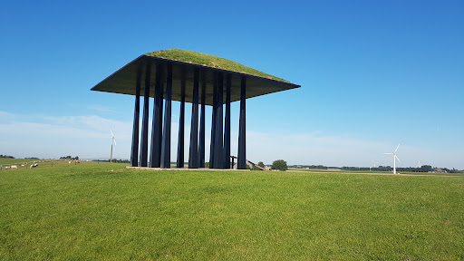 Read moreEen groen dak was wellicht een doelbewust besluit van de architect Ids Willemsma bij het ontwerp van 'de tempel' ter gelegenheid van de afronding van de dijkversterkingsoperatie in de periode 1980-1993. De toenmalige commissaris is hier in steen gelegd, tezamen met allerlei dijksgedeputeerden en natuurlijk de dijkgraaf. De scherpe belijning van deze tempel staat haaks op het glooiende karakter van de Waddenzee dijk. Een goede keuze! Waarom trouwens 10 pilaren? Ik zou het niet weten. Wellicht waren er vroeger 10 Friese...