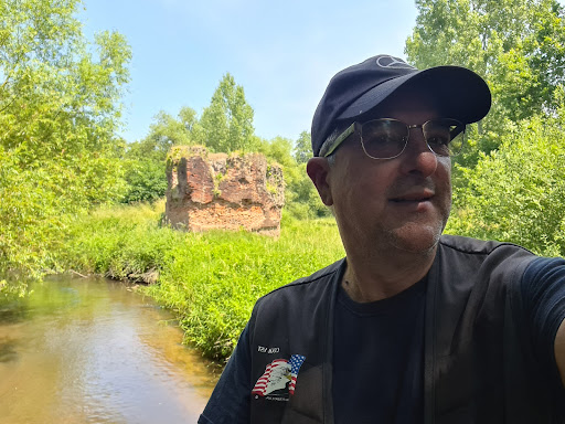 De ruïne bevindt zich schuin achter de hoeve. Lopen richting de snelweg en rivier. Prachtig uitzicht vanaf de brug.
