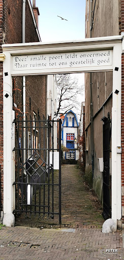 Read moreGleich um die Ecke vom Spionzahuis, zwischen der Dunne Bierkade 26 und 29, führt ein kleines schmiedeeisernes Holztor in eine charmante private Gasse, die vor Ort als Spinozastraatje bekannt ist. Auf dem unter Denkmalschutz stehende Tor aus dem 18. Jahrhundert ist folgender Text zu lesen: "Deez 'schmale Tor führt ahnungslos in den Weltraum zu unserem geistigen Wohl".