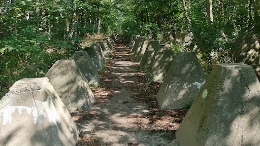 Diese sogenannten Panzersperren oder auch DrachenzĂ€hne genannt tauchen wie aus dem Nichts vor einem auf und können in beide Richtungen noch ein gutes StĂŒck weiter verfolgt werden. Die eine Seite verlĂ€uft in Richtung des Deiches und die andere Seite weiter ins Landesinnere.