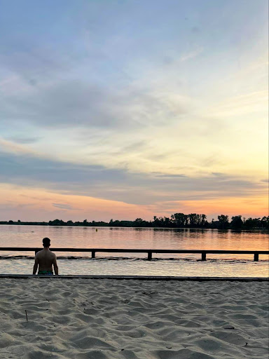 Love this place. Park at the parking lot by the local recreation facility. There is a small bar to get snacks and drinks. It is a sort walk to the beach... easy to take a stroller. There is a beach are with grass. There is also a sand volleyball court. If you walk further there is a dog beach. Great...