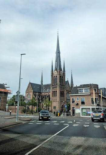 Dat deze kerk imposant is, lijkt op zijn minst een understatement: de toren van bijna 78 meter staat op plaats 31 van de lijst Hoge Kerktorens in NL (!)(wordt bijgehouden Wikipedia), ook het schip en de zijbeuken doen niet bescheiden. Dat komt zo: de vader van Nicolaas Molenaar (die later deze kerk zou ontwerpen), was in Sneek de timmerman / aannemer van een van de vele neogotische basilieken van Pierre Cuypers (die ook tekende voor het Rijksmuseum en het Centraal Station in Amsterdam). Zoon keek de kunst af, leerde het vak en werd architect. In diezelfde tijd kreeg rooms-katholiek Nederland weer het recht om, na 200 jaar in schuilkerken te hebben gebivakkeerd, eigen godshuizen te bouwen. Er zal best wel wat revanchisme hebben meegespeeld. Motto: en nu laten we ook zien dat we er zijn. Dus: de lucht in! Maar zover was het nog niet in Woerden. Eerst moest er nog een stadhuis komen. Om een lang verhaal kort te maken: B&W waren wel gecharmeerd van het stadhuis in Noordwijk (ontwerp: Nicolaas Molenaar). Maar in de tekentafelfase ging er iets goed fout. Een lokale architect ging met de eer strijken. Auteursrechten bestonden toen nog niet. Doch! Eind goed, na verloop van tijd ook al goed. Want, nadat er een Landelijke Affaire van was gemaakt (plagiaat! foei!), er een wet op auteursrechten door de Tweede Kamer was aangenomen, kreeg Nicolaas Molenaar de opdracht voor deze kerk. Of de toren ook zo hoog zijn geworden zonder die affaire? Wie het weet mag het zeggen. Woerden geniet inmiddels bijna anderhalve eeuw van dit...