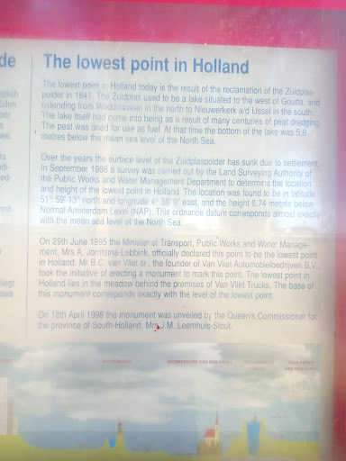 Read moreThis is considered as the lowest point of Netherlands which is 6.74m below Average sea level. That means altitude is -6.74m from sea level. Not really a touristic place since you can just see the water level meter, a bench to sit, a description on board about this place and that's it. I will suggest you if you going from here or near by then you can take a look else nothing...