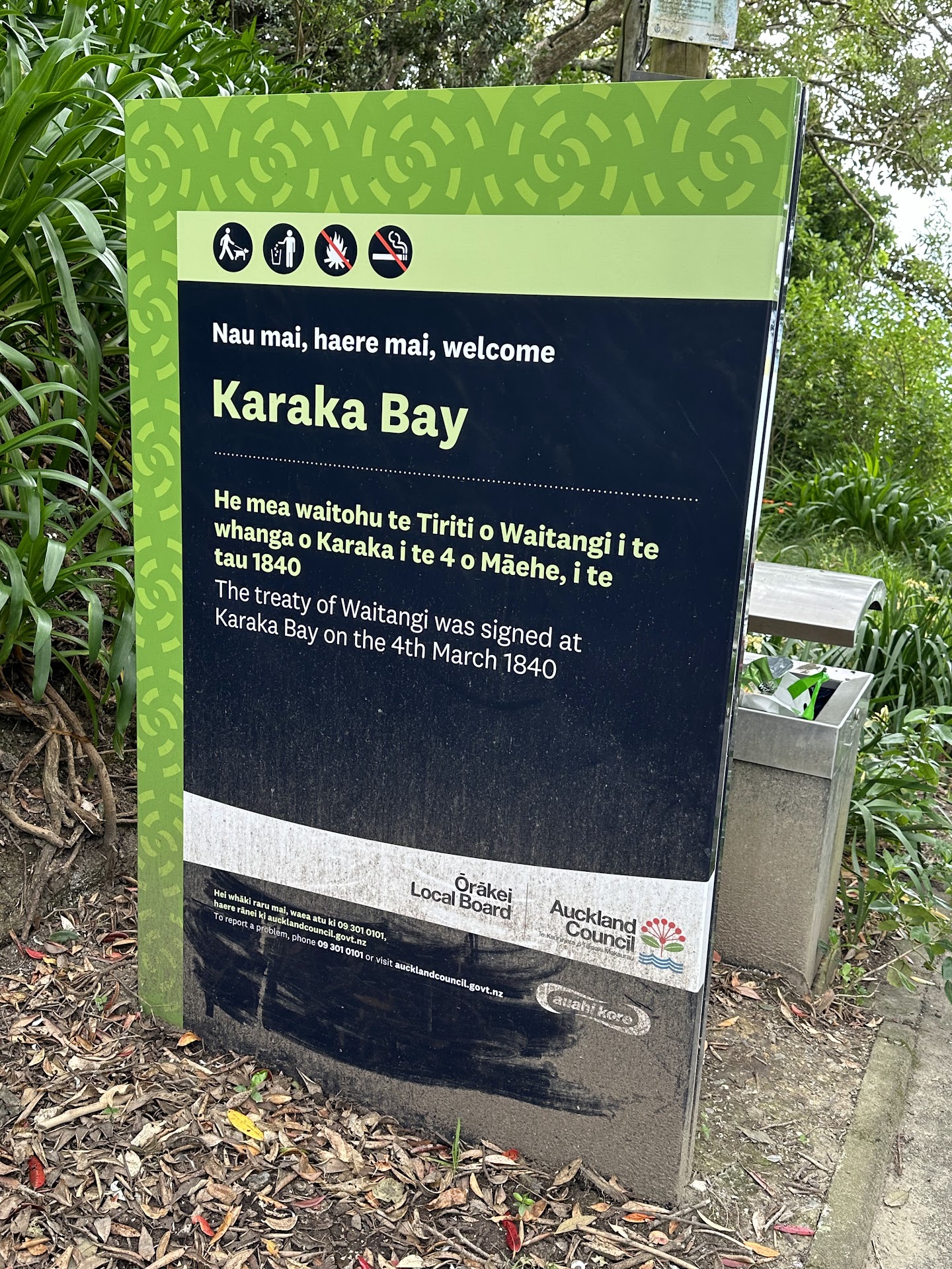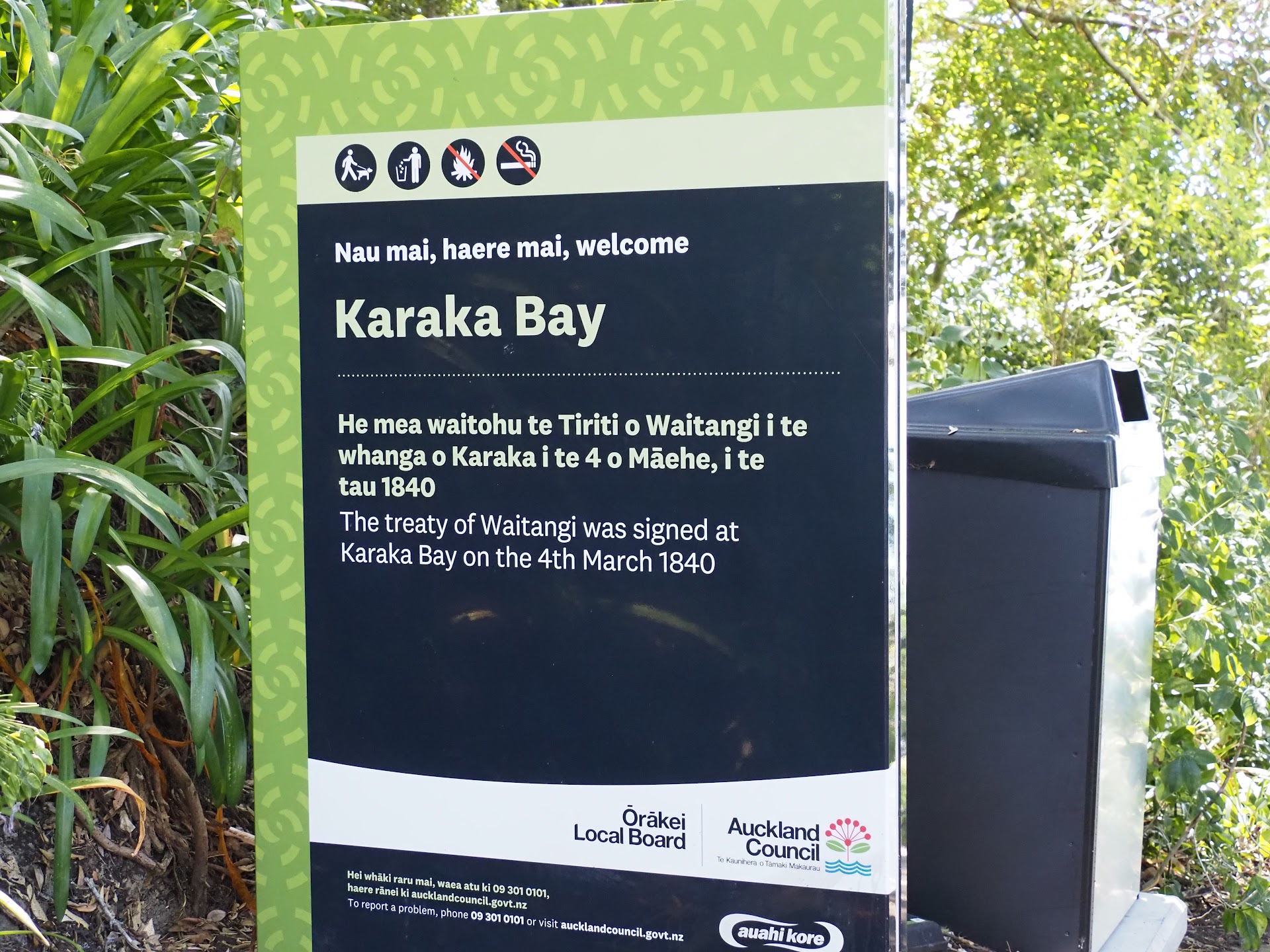 Karaka bay has a historical significance. It is the place where the final part of the Treaty of Waitangi was signed on the 4th March 1840. On that day, 17 Tāmaki rangatira (chiefs), mostly from Ngāti Pāoa and Ngāti Maru, signed the Waitangi sheet of the Treaty of Waitangi at Karaka Bay. It has been recorded that Captain Nias representing the Crown were present too. Four months later, on 9 July 1840, another six chiefs signed the treaty, with Governor William Hobson present.