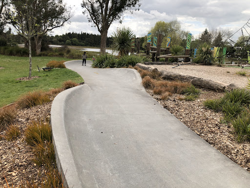 This playground is superb, fairly recently refurbished, although some of the equipment is in need of repair, the flying fox used to be a fun double, but looks like it's been decommissioned. There is an in ground bouncy pad that's been boarded up. Still plenty to do though, water play and slides. There is a pump track around the playground, and a full size BMX track next door. There are also some walking tracks around the lake if you feel like a stroll. Watch out for little kids gravitating towards the water. With the water backdrop it's the most picturesque playground in hamilton for sure! We saw a sign to some toilets behind the netball courts, but unsure if they are open...