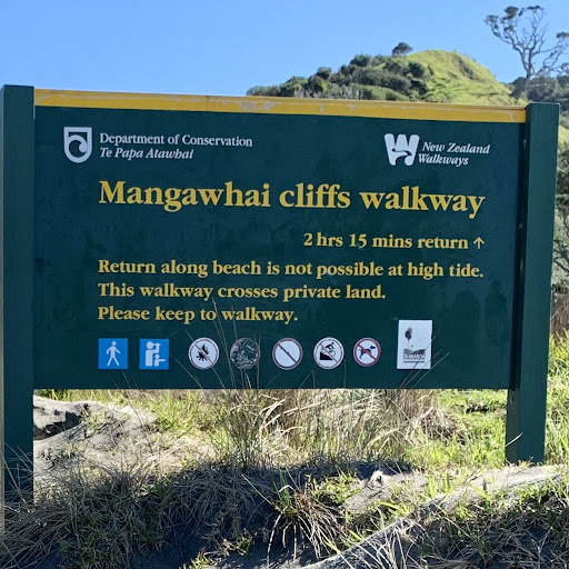 Absolutely one of our favorite hikes with amazing views from this walkway! It’s a fairly easy hike, but it will take a few hours to complete the entire circuit from the parking area. After walking about 15 or 20 minutes north on Manghawai Heads Beach, there is an access point to the cliff walkway marked by a large sign, and then it’s a short climb up on well developed trail. Be sure to do the entire trail, and walk down to the rocky beach at the north end to see the Natural Arch. If it is low tide, you can walk back to the parking area along Manghawai Heads Beach, but the north end of the beach is a little rocky, so wear good shoes or boots if you plan to do this part of the trail along the beach.