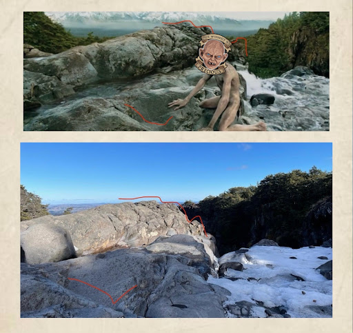 See ‘Photo 1’ for the exact location, at the edge of the waterfall, where Gollum looks back to Frodo and Sam. I’ve marked the angles of the rocks in red to show it’s the same location. (Gollum’s face hidden to avoid copyright issues!)