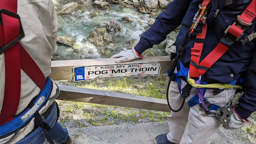 I brought a GoPro on a pole, which is no longer allowed, but Andre was very apologetic, and said that if I had mentioned when we were fitting harnesses he could have lent me a wrist-mount. If you have a camera you want to use on the lines themselves, it seems a wrist mount would be allowed and encouraged, but I would always check first. There are plenty of opportunities to take photos and videos with your camera or phone when you are walking between launch and landing sites, as long as you have a zip pocket to store it in while riding. A zipped up backpack is allowed on the lines.