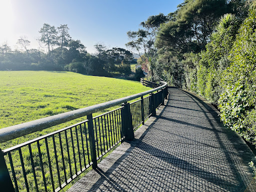 Or you could choose to walk around the sports field. Why not head off through the bush. There's a track that goes through the bush on the other side that starts between 51 - 53 Churchouse Road. A small 10 minute return, but a nice add on over a wooden walkway and steps...