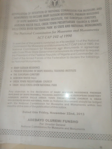 National Museum, Calabar was built in 1959. It is notable as a home to the relics of the Calabar slave trade including names of people that aided it and the currency of the slave trade. It was built by colonial masters in 1959.