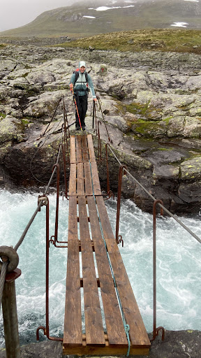 The hike from the DNT hut to Flåm is also though, difficult and beautiful. Big part of the hike is high, around 1200m and it was very misty. Next there is a very technical parts with only rocks. There was a steep bit of snow we had to cross which was difficult. In the end the hikes goes through wet areas and a forest, with a beautiful view on the fjord and a multiple waterfalls.