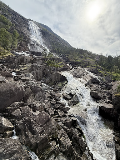Langfossen is ranked top 20 in the world's most beautiful waterfalls. The waterfall starts at 600 meters above sea level and goes all the way down to around 50. You can drive all the way to the bottom of the waterfall where you can buy food and some drinks. If you have decided to climb the mountain you shouldn't bring too heavy of a backpack as its very steep all the way. If you are going to the viewpoint its important that you go all the way back to the original path because if you don't, you might get lost. When you get to the top of the waterfall you will see that there are a few mountains surrounding it, which you will have to climb in order to gain mobile connection. Overall the view from the top is very beautiful, I would also not recommend bringing any children under the age of 12 unless you are willing to carry them throughout most of the trip. The trip should take 2-4 hours one way, depending if you are carrying heavy...