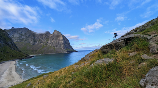 The beach was beautiful, but unfortunately it had a lot of toilet paper and poop (we didn't leave ours there). The trail was quite hard to follow since it only indicated Ryten. At one point during the trail, you can see a massive ridge with people walking along it and naturally you follow. Unfortunately that's the trail to Ryten, not Kvalvika beach. Instead look for a white sign on a rock that says Kvalvika and expect it to be hidden. This place is at the top of the mountain and from there you're very close to the beach but you cannot see it. The descent down to the beach is very steep and long but at least you have a great view of the beach and mountains and ocean. The beach is kind of overrun with people; there were at least 22 tents when we stayed (including ours). There is also a lot of wind and sheep. To get there we took the 300 bus from Moskenes kai (you can also take the 742) to Fredvang kryss. From there we walked 4 km to the trail head (which can be found on Google maps) and then walked another 4 km to the beach via the trail via Innerland. There are some creeks you can get water from but make sure to purify or...