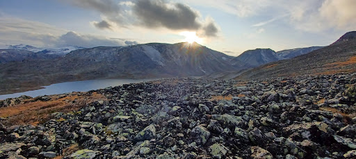 We decided to complete a loop back too the DNT via Glitterrundhøe 2089m and Ryggjejøe 2142m. 17.2km total but we wouldn't recommend it.. extremely slow going due to the steinrøys/landslide rocks. Relentless bouldering on an unstable footing. It was tiring and ankle breaking waiting to happen. No signage so clearly not a recommended route, although the views were amazing and we got to experience sunset by the...