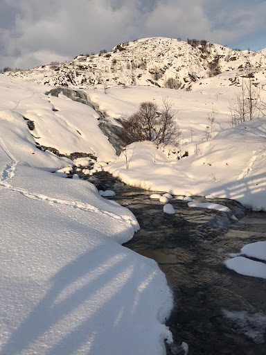 We travelled to Lofoten at the end of January, so due to the weather conditions and a lot of snow there were not too many outdoor activities or hikes we could do. So we were looking for easier walks or strolls and this one is nice and easy to do also in winter and with a lot of snow. You can park the car in Sorvagen and follow the trail, which is well maintained also in winter, and walk around the lake and pass by two waterfalls. Takes maybe 1-1,5 hrs, nice stroll on a sunny winter day. We had considered maybe also hiking up one of the closeby mountains from here but if there is a lot of snow in winter you can forget about that as you just cannot see the trail. So we stuck to the easy walk around the lake, which was also nice. What was also interesting to see was the many, many animal traces in the snow, a lot of action here apparently even when you don't 'see' any wildlife (we did see an eagle...