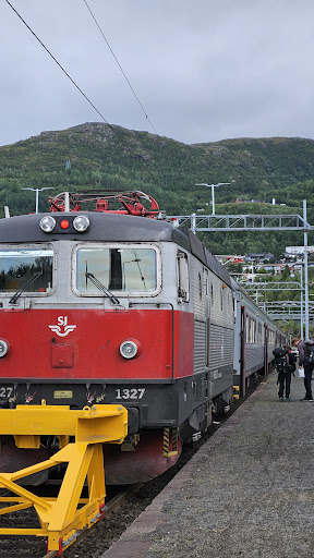 Read moreIls promettent monts et merveilles, une grande publicité dans l'émission française pour un train aller en panne 1h et un retour, encore coincés 1h. Ne prend pas en compte le pass Nordland alors que Bjornfjell est la dernière ville avant la frontière qui est dans le Nordland. J'ai ajouté les 2 photos des 2 trains en retard pour preuves avec les gens très patients. Contrôles très rigoureux des contrôleurs strict.es avec les personnes qui ne " seraient " pas en règle, ( alors que tout le monde a acheté son ticket). Je déplore l'entretien des trains. Impossible d'ouvrir les fenêtres pour apprécier le paysage ( fortes odeurs des randonneurs). Vitres tellement sales qu'on ne voit pas bien le paysage magnifique. Je déconseille cette entreprise SJ. Bar à bord qui ne prend pas les espèces. Impossible de prendre son ticket à la gare car c'est tout par internet. WC dans le noir absolu ( dû aux pannes), +impossible de recharger le téléphone de ce fait. Un attrape touristes pour 660 NOK aller et retour. Aucune information en anglais au micro dans le train lors des pannes. Les randonneurs sont partis à pied à 2km d'Abisco centre touristique l'arrêt juste après !! Heureusement les Norvegiens ont traduit. Une seule personne pour gérer 2 locomotives : courage à lui. Il a été efficace et sérieux, et assez rapide pour lui tout seul. Gloire à lui! Logistique au dessus de lui à revoir !!! Le train bleu de l'émission est remplacé par des vieux coucous des années 90. Enfin, j'avais pour espoir et vu sur internet qu'il y avait des explications au micro ou un guide : rien du tout. La culture Sami, les mines et l' historique du territoire, merci Wikipédia. Pour finir : la cerise 🍒 sur le gâteau. Après 2 contrôles de nos tickets valides et validés 2 fois, la contrôleuse vient nous réveiller alors que, personnellement, je m'étais profondément endormie 5 min (sur 1 trajet de 6h), pour nous re- contrôler à nouveau...
