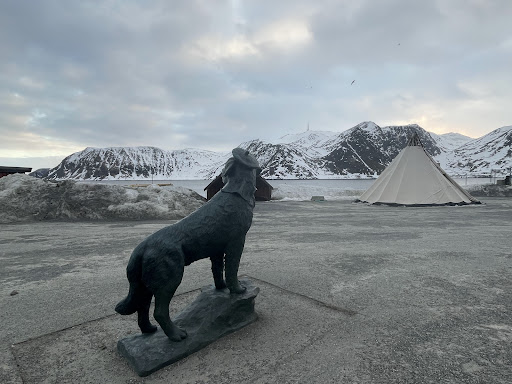 «The St. Bernhard dog Bamse (Norwegian for «teddy bear») came to Honningsvag in 1937. The owner, Erling Hafto, was harbour master in Honningsvag from 1932 to 1968. Bamse was a large and gentle dog, and he loved to play with the children here in Honningsvag, who would ride him like a horse in the summer and have him pull their sledges in the winter. Mr. Hafto was captain on board the patrol boat «Thorodd» which was stationed in Tromse in 1939. After the outbreak of WWII, the Norwegian King Haakon VII, Crown Prince Olav and their entourage escaped on 7 June on the cruiser «Devonshire». They left from Tromso and their destination was England. The «Thorodd» followed the cruiser and Bamse was on board with his owner. During WWII the vessel used the ports in Montrose and Dundee (Scotland). Photos of Bamse wearing a Royal Norwegian Navy sailor's collar and cap or a metal helmet were sent to Norwegians all across the world, particularly in connection with festive occasions such as Christmas and May 17th. The vessel «Thorodd» was converted into a minesweeper during the war. Captain Hafto was in charge of the minesweeper until 9 September 1940, when he was assigned to the minesweeper «Nordkapp», which was operating out of Iceland. The crew of the «Thorodd» strongly opposed letting Bamse follow the owner. This is how the incredible story of the sea dog Bamse starts. Even after 60 years, articles, books and TV report about Bamse are still being produced. Bamse's connection with Honningsvag was further reinforced in that the ship's senior officer on board from 23.2.1942 to 24.6.1944 was lieutenant Oscar J. Jenssen. After the war he was appointed official ship's pilot in Honningsvg (1952-1974), and became Bamse's new «master». Bamse died on 24 July 1944. More than 800 children and adults attended the funeral, which took place with full military honours in Montrose. On 30 September 1984, Bamse was awarded Norges hundeorden, and in July 2006 he received the PSDA Gold Medal, which is the equivalent of the George Cross (GC) but for animals. On 17 October 2006, a bronze statue of Bamse was erected in Montrose. erected in Montrose. The statue was unveiled by HRH Prince Andrew - The Duke of York, KG, KCVO.»