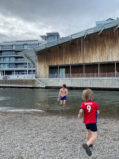 Ret ok strand. Det er absolutt ikke for eldre og folk med fx. rullestol. På selvebystranden er det stort set barn som leker i gruset. Det gir utrolig mye støy når lyd kastes tilbake fra vegger. Til gjengjeld er det litt varmere og mye mindre bølger og rimelig lavt inne i grusstrand området. Omkring ved skulpturparken og på kanten rundt er det ofte besatt av ungdommer og det er bra å spring ut i det dype fra Park Kaien. Det kan dog være magneter og det er en god ide å se etter om det er en av de dagene før man hopper i, men det er umiddelbart veldig trygt. Det hadde været fint om båttrafikk faktisk tok ekstra hensyn og holdt lavere hastighet og mer avstand enn det som er i dag. Men sentralt og flott område for Vika og Frognerfolk flest med mer, ibland er det litt turister og folk nord og vest fra landet også… Det kan ofte være svært å få en plass så vil kanskje anbefale folk fra andre bydeler å dra til Operastranda eller Sørenga.. hvem vet kanskje vannet fra Elven en dag blir så rent at man kan bade trygt i Bjørvika… Munch kunne have vært en bra spiller som utspringstårn.. om man bare fikser litt på platerne i bygget og fikser arkitekturen til å bli litt mer inkluderende! Men den her strand og Renzo Pianos bygg er altså helt ålreigt, veldig flott arkitektur og inkluderende museumsarkitektur på Arker brygge (men det sier vel seg sjølv, når man får tag i en så dyktig...