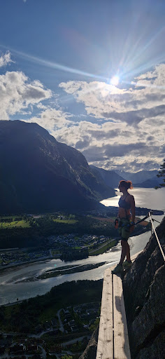 Amazing Via Ferrata, grade D, challenging but amazing views that kept getting better and better! Great assortment, lots of variability: bridge, wood, climb, overhang and technical elements! Well maintained and I can't comment enough about the breathtaking views! Info; Park in Åndalsnes and walk up (we had climbed Romsdalseggen Ridge the day before and spotted the VF on the way down the trappene) the walk is 15 mins ish depending on your Fitness level to the main start area and then another 10/15 mins walk into the forest to start the VF, kit up there. There are two VFs an intro one (beginner) which ends about 300m into the trappene, 20/25 mim walk down and VestVeggen (West wall for experienced) ends at Nesaksla (Rampestreken route) where there is a magnificent viewpoint we had hiked too the day before. There is also a resturant and toilet facilities. There is an option to get the cable car down (not sure on cost) or take the steps. So, there is fun for all the family of all abilities. We had our own kit, you pay a fee of 100kr per person, but you can rent kit/guide from the Norsk Tindesenter