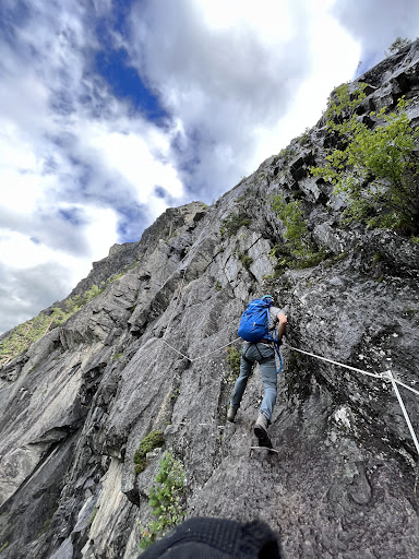 The Romsdalsstigen West Wall is a fun challenge for experienced via ferrata/rock climbers. If you can climb 5.9 in the gym and 5.8 outdoors and have above average physical conditioning and stamina you can do it. Took us 2 hours 45min from the end of the pavement to the gondola but we were NOT in a group and didn’t get stuck behind anyone. I suspect this could truly take the 5-6 hours the website claims in a group. Things to know: -There is no parking at the start and the start is 1.2 miles from the gondola ($350 NOK) which you most likely want to take down after the via ferrata. If possible have someone drop you off at the start of the via ferrata to skip a long walk through town. -There is a decent amount of very steep uphill climbing at the start and in between sections of the via ferrata which was the most difficult part for my husband who is a better climber than me -I could see the via ferrata being difficult if you are shorter than 5ft 4in. There were many sections where I could just barely reach the next clip or hold. If you are shorter I recommend you be a better climber than stated above and be able to use the natural rock more -This via ferrata uses a lot of traditional metal bars/rings/foot holds. There are some brief sections that rely more on natural rock -There are several (I think 4) overhangs that were challenging but have very good holds. You need a little extra upper body strength to get over them -This was fun even on a misty day and kept the wall cooler. You can always take the gondola back up another sunny day and hike the ridge to...