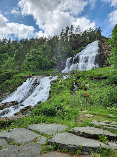 Svandalsfossen has a fall of 180 meters in total. By Fv. 520 you can park and walk under the bridge to really experience the waterfall close up. In 2006 an impressive bridge and stairway system was opened under the auspices of the Norwegian Road Directorate's National Tourist Road Project. The stairs are steep and lead up to the foot of the upper waterfall, where you will be rewarded with a...