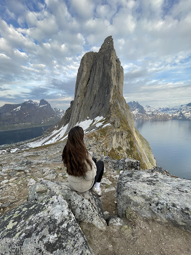 It took me 2 hours to climb up and 1.5 hours to come down. However, halfway through, I started feeling insecure, and it started to look more like climbing, with so many rocks and snow, than hiking because I think we went the wrong way (but we followed the blue dots… so I don’t know what happen). In our case, there was still quite a bit of snow, which made the path more dangerous. Eventually, we realized we weren't in the right place, for the view of segla, and we tried to go to the right spot following our instincts (and we were successful) (though I'm not sure if it was through the right path). Going down was really difficult because, as I mentioned, there was a lot of snow, and I think we were actually in danger... luckily, slowly and with a lot of caution, we managed to pass that part safely and then found the trail again to continue the descent.